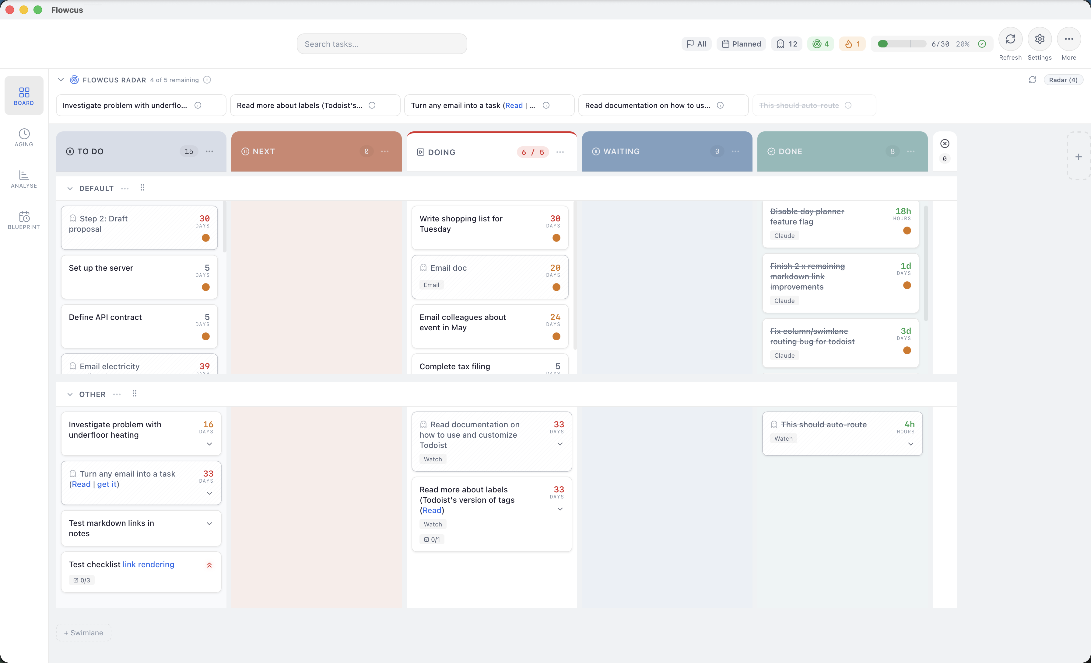 Flowcus is a macOS app that adds a personal Kanban board on top of the task manager you already use. It connects to OmniFocus, Things, Todoist, and TaskPaper — letting you see what's stuck, what's overloaded, and what to focus on next, without replacing your existing workflow.