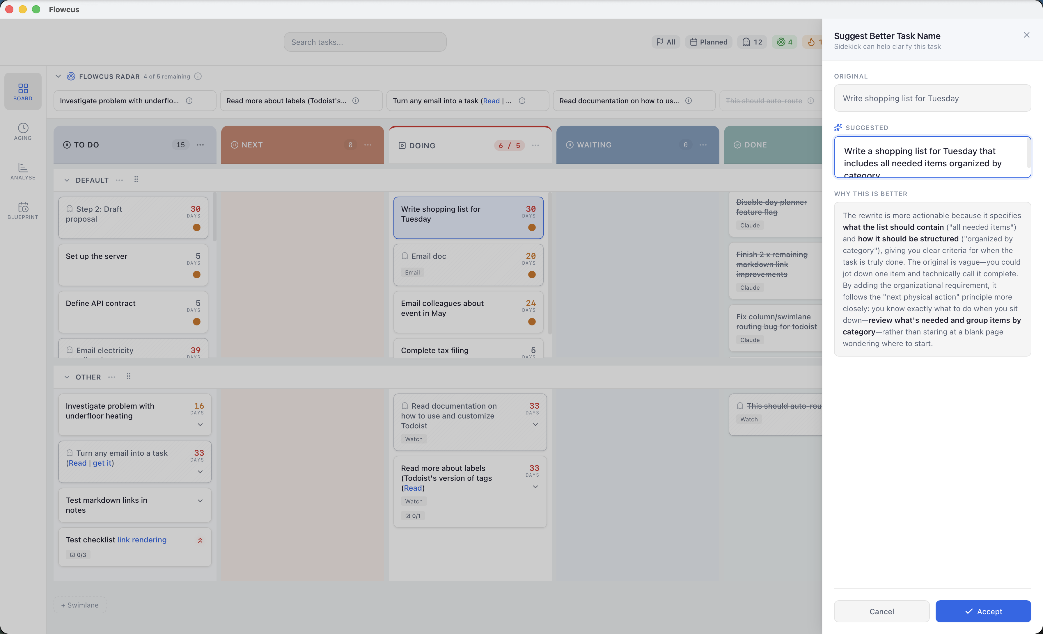 An LLM-backed assistant that refines vague tasks into clear next actions, executes natural-language board commands, and summarises your week — all without leaving the board